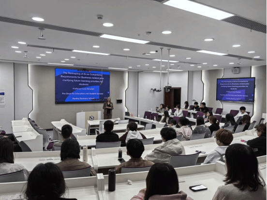 接下来,Lucy Newton教授带来了Master Class《人工智能重塑商业:机遇与挑战》,她结合丰富的行业案例,深入剖析人工智能在商业领域的前沿趋势,让学生对行业动态有了更清晰的认知。活动最后进入答疑环节,两位老师针对留英签证、课程衔接等问题逐一解惑,为学生海外深造提供精准指导。最后,师生在学院楼内合影留念。